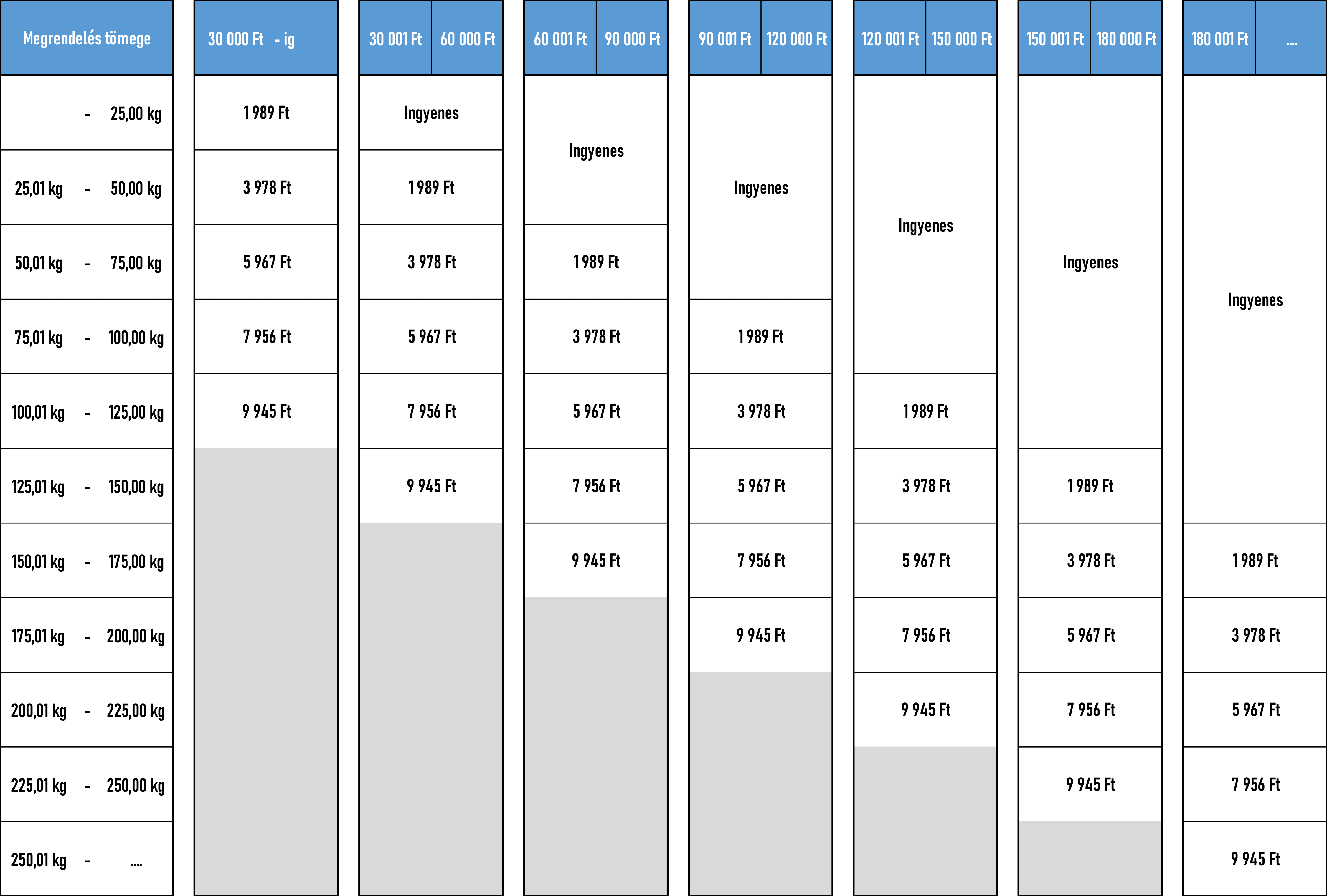 25 kg összsúly meg nem haladó, bruttó 30.000 Ft feletti megrendelések esetében a kiszállítás díja INGYENES.